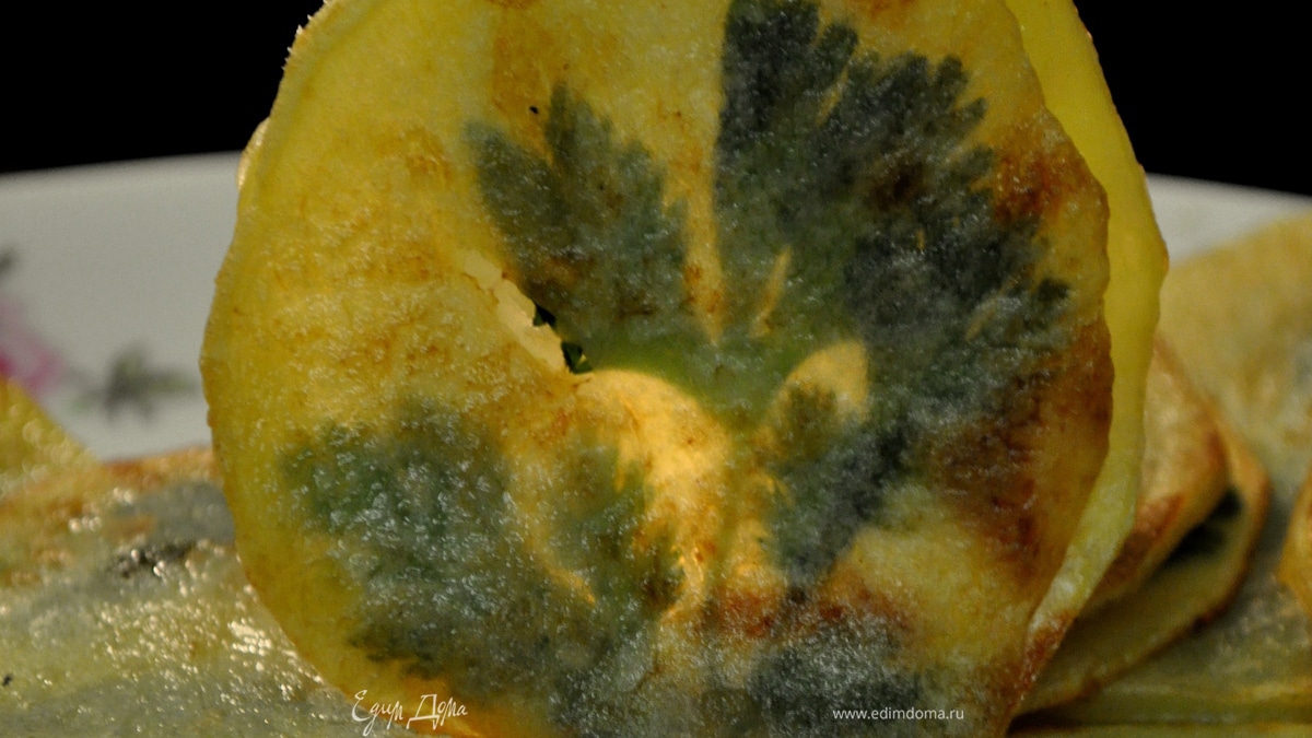 Затем берем один ломтик картофеля и выкладываем на него листок петрушки.Как следует разравниваем листок и сверху накрываем еще одним ломтиком картофеля. - Шаг 3