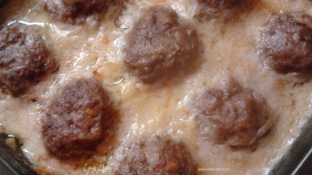 - Шаг 5Получившимся соусом залить наши шарики и выпекать еще минут 20.Подать с рисом и консервированным перцем.Приятного вам аппетита!