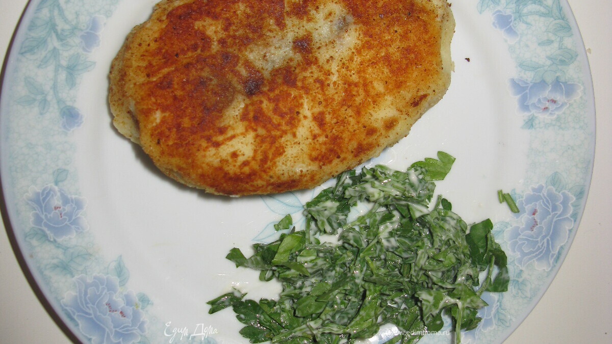 Картошку слить, добавить немного масла, 1 яйцо, никакой жидкости, должно получится густое пюре. Быстро пока горячее делать пирожки. Я не добавляю муку, поэтому надо приноровиться их лепить. Взять часть пюре, положить на посыпанную мукой доску, распределить до толщины 1, 1,5 см, сверху начинка, потом плоским ножом загибать края к центру. Если плохо получается нож можно намочить. Посыпать панировочными сухарями или мукой сверху. Самое сложное снять с доски. Опять же ножом как бы срезать пирожок прямо в руку, а в руках уже доформировать. - Шаг 4Можно оставить в холодильнике не больше чем на сутки на доске, щедро посыпанной мукой. Жарить быстро, до румяной корочки. С квашеной капустой тоже хорошо (на любителя). Подавать с овощами или с зеленью со сметаной.