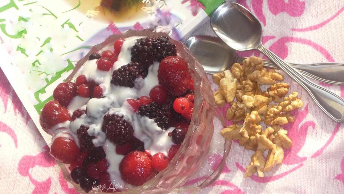 - ПодготовкаРазморозить ягоды п выложить В тарелку, полить йогуртом, мятный сироп (если берёте натуральный, то сахар добавьте по вкусу), посыпать рублеными грецкими орехами.Подавать с песочным печеньем.
