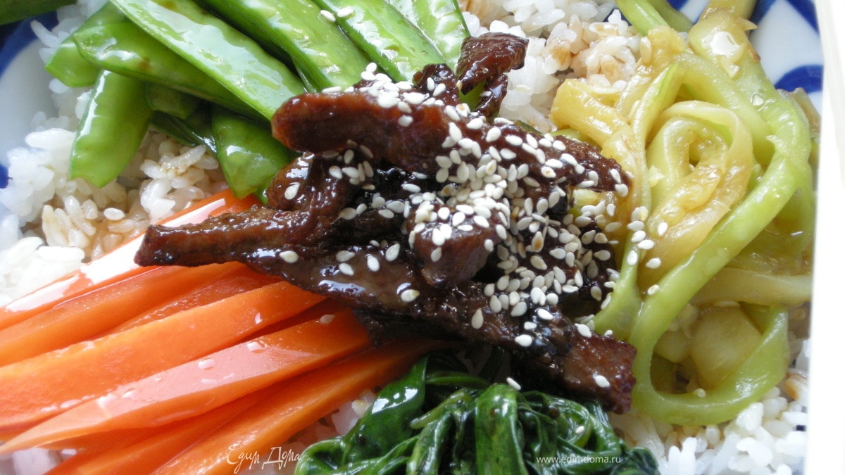 На дно глубокой тарелки выкладываем рис, в центр мясо, по кругу овощи. Поливаем всё кунжутным маслом, соевым соусом. По желанию посыпаем жгучим перцем и кунжутными семечками.