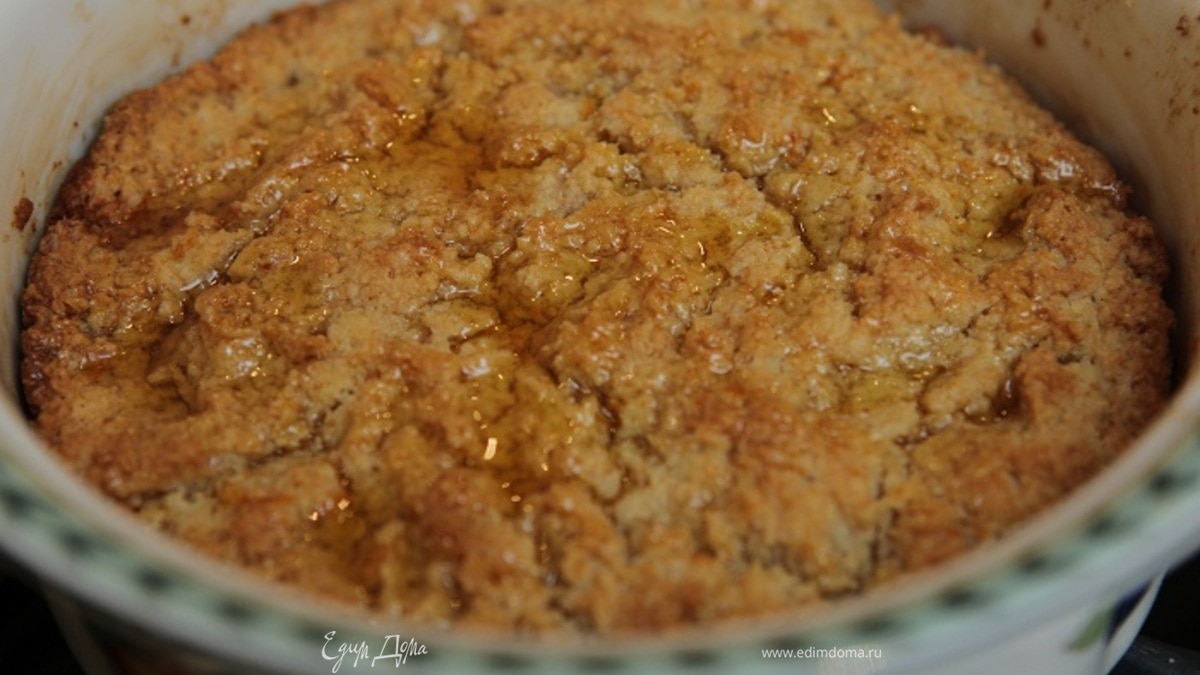 Керамическую форму для выпечки смазать оставшимся сливочным маслом, налить на дно 3–4 ст. ложки сиропа, выложить тесто и равномерно распределить его. - Шаг 7