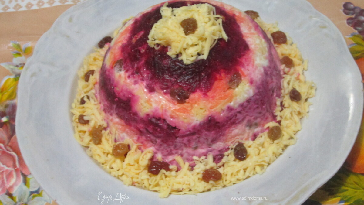 Глубокую ёмкость для салата нужно намочить немного водой и выстелить пищевой плёнкой. Итак, первый слой у нас будет отварная свекла с мелко нарубленными грецкими орехами, второй слой - морковь с изюмом, третий - сыр с чесноком и так до тех пор, пока не закончатся приготовленные нами компоненты салата. Каждый слой хорошо смазать майонезом и уплотнить. - Шаг 2
