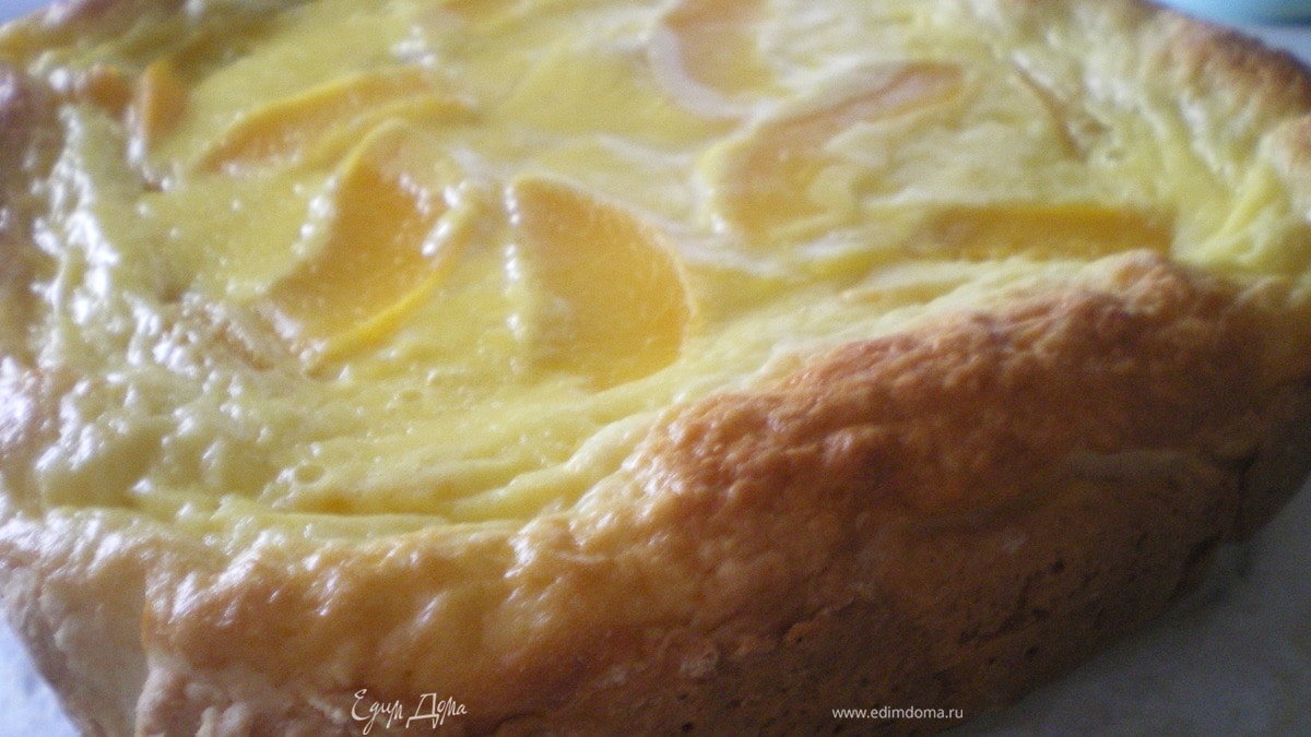 - Шаг 1Персики вынуть из сиропа и нарезать тонкими ломтиками. Йогурт смешать с крахмалом и взбитыми яйцами, добавить к фруктам и перемешать.