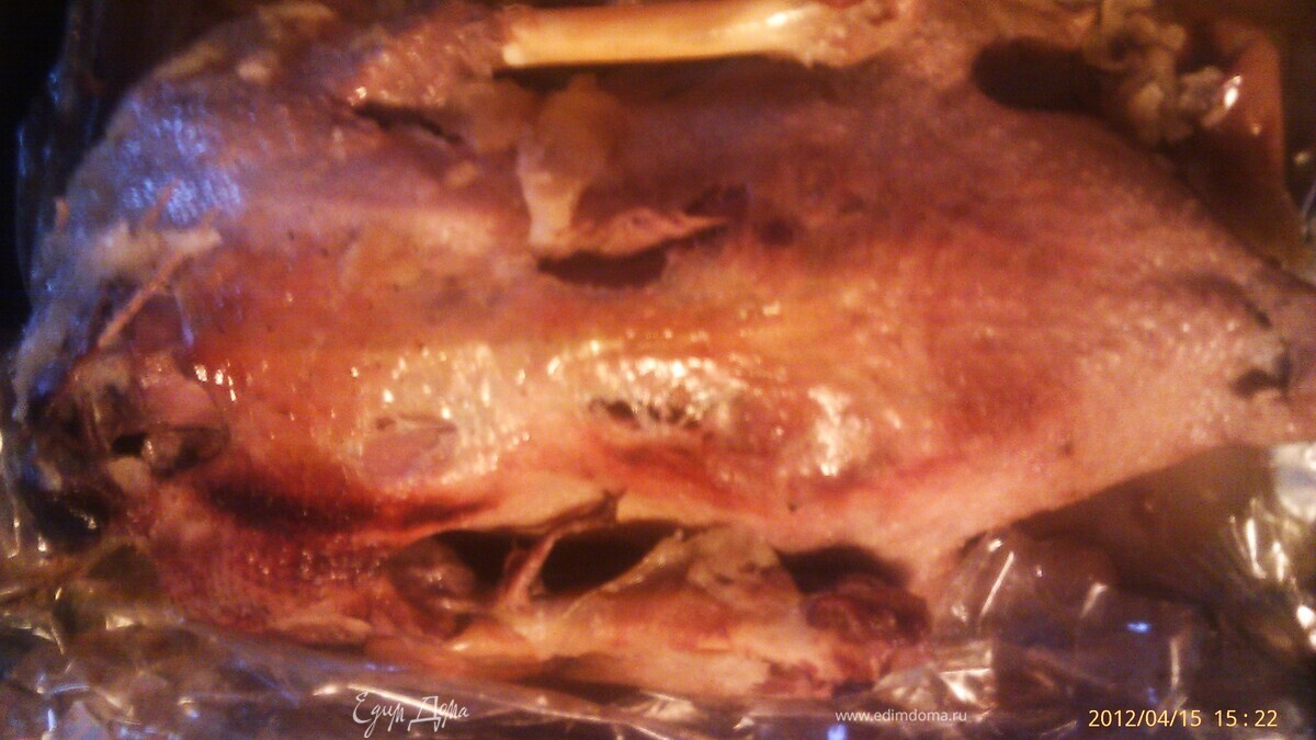- ПодготовкаБерем тушку гуся 2,5 кг. Очищаем от остатков пера (если есть), внутри животика очищаем от почек и легких, достаем упакованную на птицефабрике печень, сердце и желудок. Живот не разрезаем! Кладем в воду с уксусом - гусь будет мягче. У меня обычно он стоит ночь. Жир не выбрасываем. Пригодится при запекании. Утром обсуштваем гуся полотенцем и натираем солью с молотым перцем (лучше свежемолотым). Очищаем от серцевины любые кислые яблоки(лучше антоновку - но по сезону она не всегда есть - поэтому - просто кислые яблоки). Разрезаем яблоки на 8 частей. Внимание! Кожуру яблок очищать не надо! Соль для натирки беру из расчета одна столовая ложка на 1,5 кг гуся. Смешиваю соль и перец и натираю гуся внутри животика и с наружи. Закрываю шею зубочистками - можно зашить очень грубой ниткой - после приготовления легче будет снимать нитку. Закладываю внутрь животика яблоки, оставляя место на расширение при готовке. Разогреть духовку до 240 градусов. Пока духовка греется, укладываем начиненного гуся в пакет для запекания, на гуся укладываю снятый при потрошении жир - будет сочнее,когда закрыли кончики пакета замками (или лентой), отправляем гуся на противень, предварительно застеленный фольгой. Пакет прокалываем в нескольких местах зубочисткой, чтобы выходил воздух. Ставим в духовку на 30 минут при температуре 240 градусов, чтобы гусь "схватился". По окончании указанного времени, убавляем темпертуру до 160-180 градусов и ставим таймер на 1 час. После запекания в течение 1 часа достаем гуся, переворачиваем вместе с пакетом для запекания и продолжаем запекать еще один час. Из пакета жир выливается, но это не страшно - гусь получается сочный и мягкий. После запекания в пакете - достаем противень из духовки, включаем гриль и ставим уже освобожденного от пакета гуся под гриль для корочки (кому нравится).