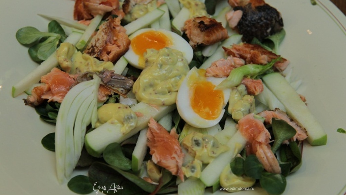 Листья салата выложить на блюдо, сверху разложить фенхель, яблоки, яйцо и рыбу. Подавать с майонезной заправкой.
