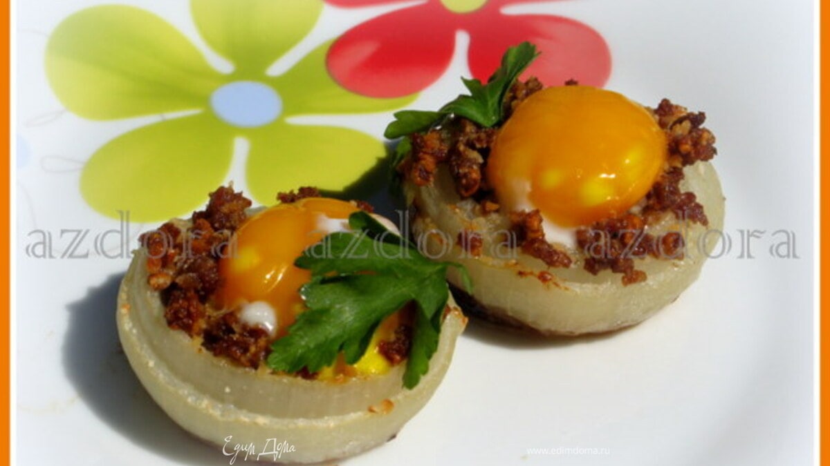 Наполнить лук начинкой так, чтобы в серединке оставалось небольшое углубление, куда потом должен пометиться желток.Запечь фаршированный лук при 180° 10 минут. - Шаг 6Тем временем приготовить яйца. Отделить белки от желтков. Через 10 минут достать лук и поместить в углубление каждой части луковицы желток. Вернуть в духовку ещё на 5 минут.