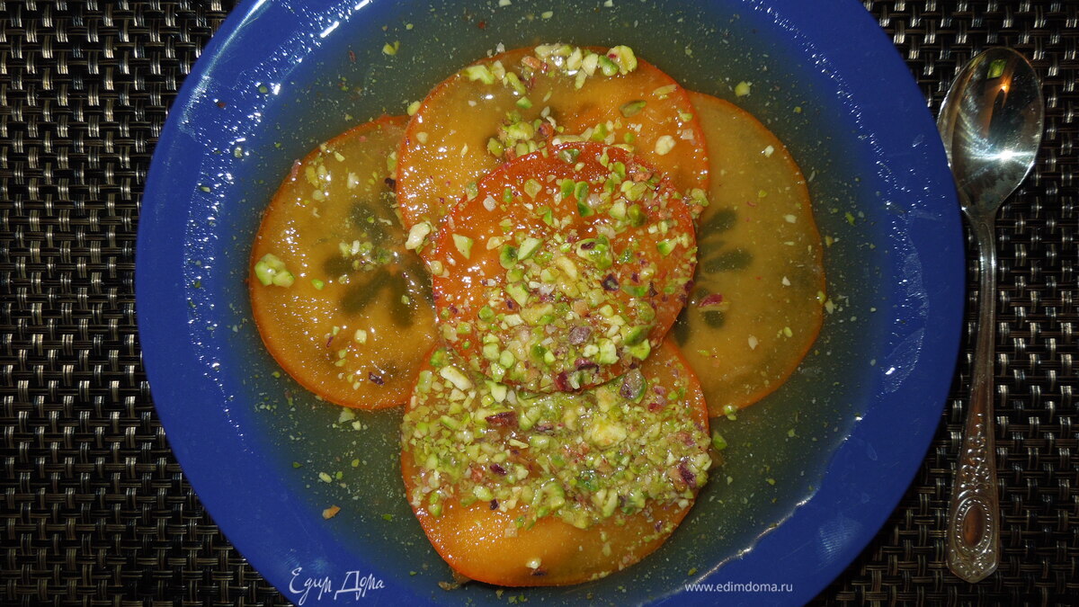 - Шаг 3уложить красиво хурму в блюдо с небольшой каймой и залить соусом.