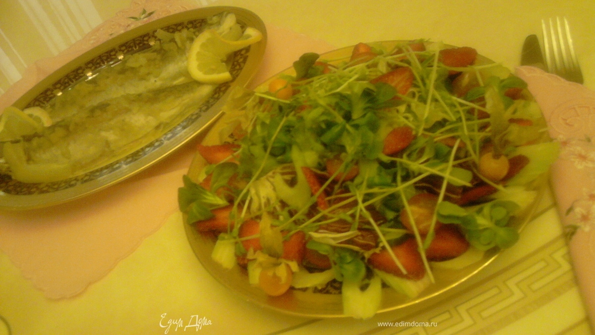 Я знаю достаточно много счастливых семей, в которых супруг полностью удовлетворяет все материальные потребности членов семьи, а супруга в свою очередь посвящает все свое время налаживанию быта, приданию уюта своему домашнему очагу, воспитанию детей, заботится о здоровье своих близких и уделяет особое внимание приготовлению так необходимой всем нам еды, а также всевозможных угощений и яств, чтобы порадовать и супруга, и детишек. Как же, должно быть, счастлив тот мужчина, которого вечерами ждет дома любящая жена, при этом превосходно выглядящая, в прекрасном настроении, да еще и с накрытым столом! Однако существует гораздо большее количество семей, в которых оба супруга работают целый день и, к сожалению, проводят очень мало времени вместе, за исключением вечеров среди недели и, если получится, двух выходных дней! Естественно, совершенно нет времени на приготовление шикарных ужинов. Именно так происходит и у нас. В моей семье принято готовить ужины ежедневно, мы любим только все свежее, а не разогретое в МВ, именно поэтому мне известно какого это накормить своих любимых вовремя, вкусно и красиво! Надо сказать, что супруг мне всячески помогает и очень часто мы готовим вместе. С опытом семейной жизни приходит и мастерство готовить быстрые и, что самое главное, легкие блюда, т.к. употреблять их приходится уже после шести часов вечера... У меня в копилке имеется несколько таких рецептов, на приготовление которых может уйти от силы 30 минут. Единственное условие – это качественные продукты и обязательное присутствие свежих овощей или салатов из них. Разрешите мне поделиться с Вами одним из моих быстрых и легких ужинов, на этот раз – «Форель радужная с имбирем» и «Микс-салат с ростками бобов и клубникой под маслом авокадо».