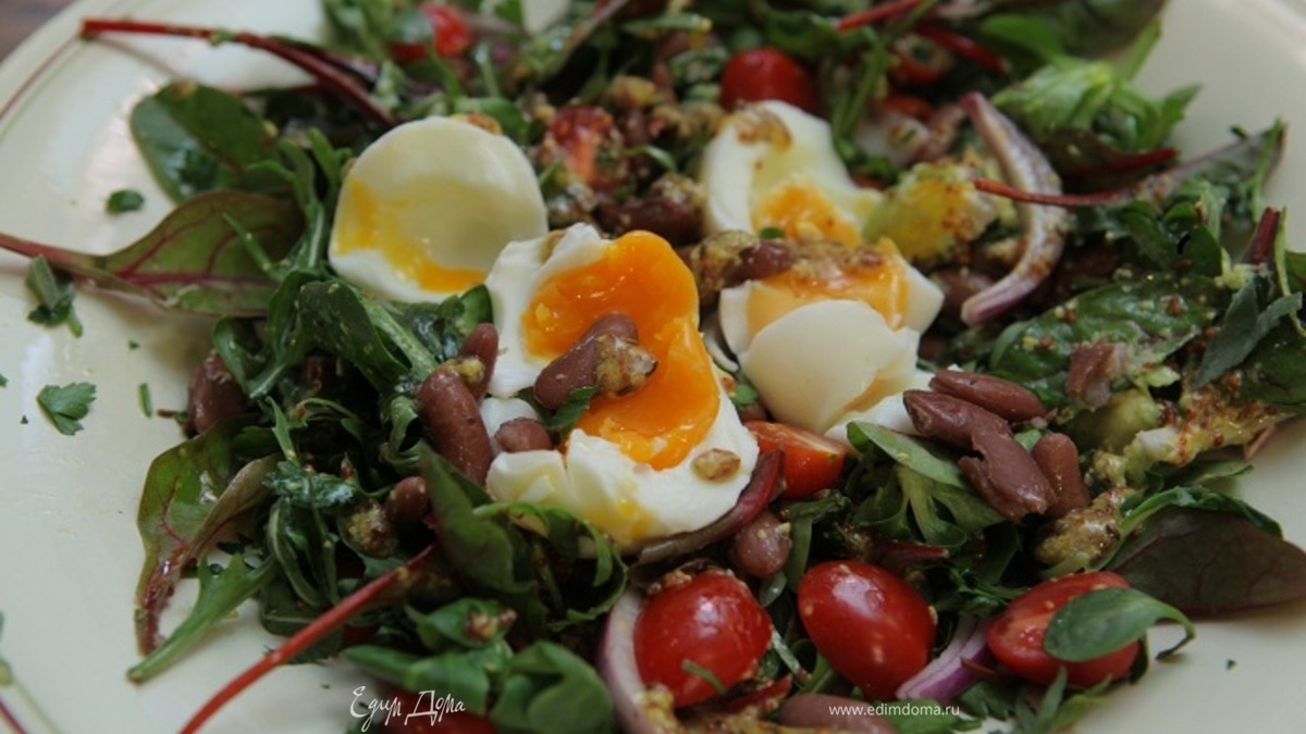 Сверху разложить яйца и сбрызнуть оставшейся заправкой.
