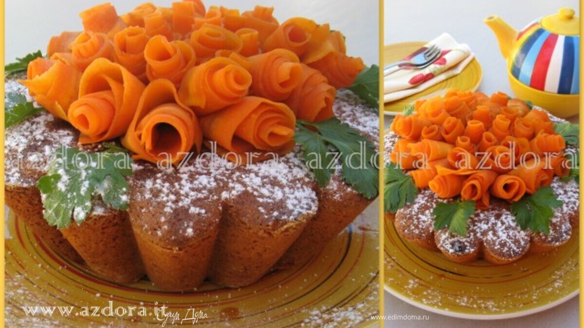 Очень люблю морковную выпечку. Решила выставить этот рецепт, т.к. он принадлежит одному очень знаменитому кондитеру Италии. Стоит обратить внимание, как и в какой последовательности соединяются между собой в рецепте ингредиенты.Очень оригинально укаршение морковью.