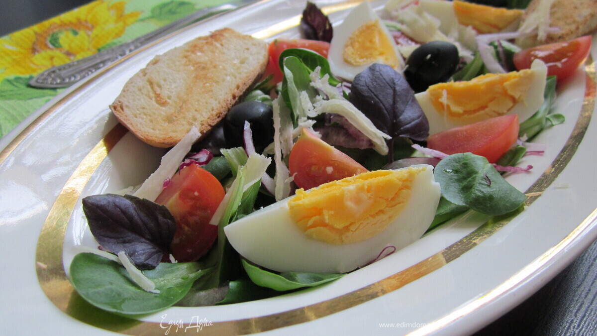 Салат вымыть, высушить и выложить на тарелку. Помидоры черри разрезать на четвертинки и разложить на листья салата. Также поступаем и с яйцом, разрезать на четвертинки и выложить на тарелку с салатам. Добавляем маслины, базилик и красный лук, нарезанный очень тонко. Добавляем немного пармезана. Если есть необходимость, посолить и поперчить. Готовый салат сбрызнуть бальзамическим уксусом и полить хорошим оливковым маслом. Два кусочка багета подсушить и положить на тарелку с салатом. Можно наслаждаться легким ужином. Приятного аппетита!