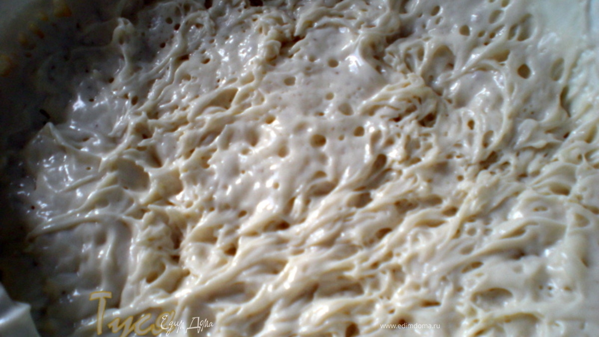 - Шаг 12Если закваска стала водянистой и с резким кислым запахом,это означает,что она перезрела,тогда нужно соскрести верхний слой и выбросить.Оставить серединку,где тесто похоже на пчелиные соты.От серединки должен исходить приятный запах.Подкормите как обычно.