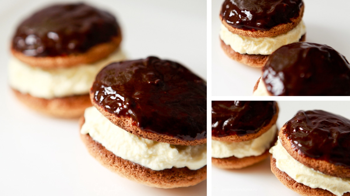 Взбейте сливки с сахарной пудрой. На оставшиеся бисквиты отсадите взбитые сливки, накройте глазированными бисквитами.
