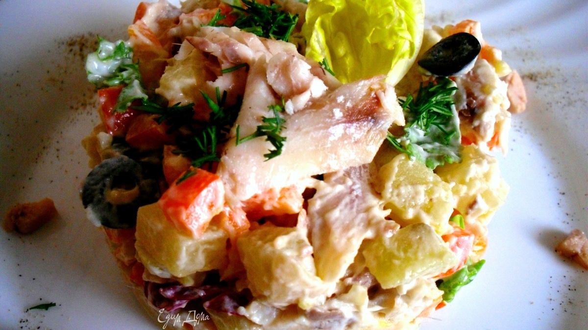 - Шаг 1Картофель нарезать кубиками, рыбу разобрать на филе, перец кубиками, маслины кружочками, чеснок через пресс или кусочками, нарвать салатные листья. Все соединить.