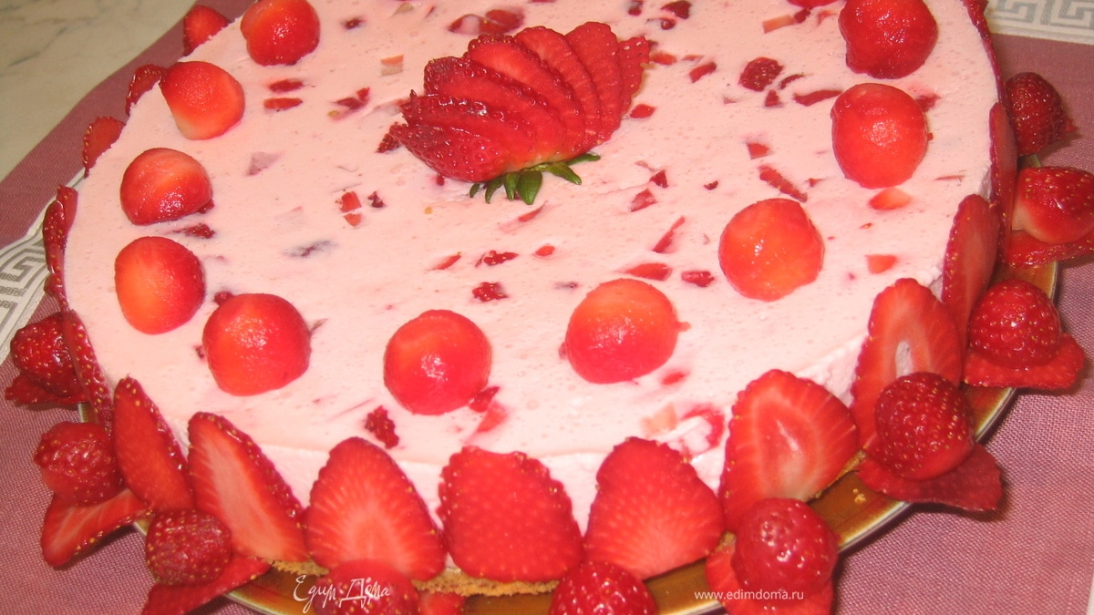 Украшать торт можно на свой вкус после того как избавитесь от бортиков формы. Предлагаю свой вариант: вырезать шарики из клубники, несколько ягод нарезать пластинками и разместить по бортикам торта, а одну ягоду раскрыть в виде веера и поставить в центр торта.