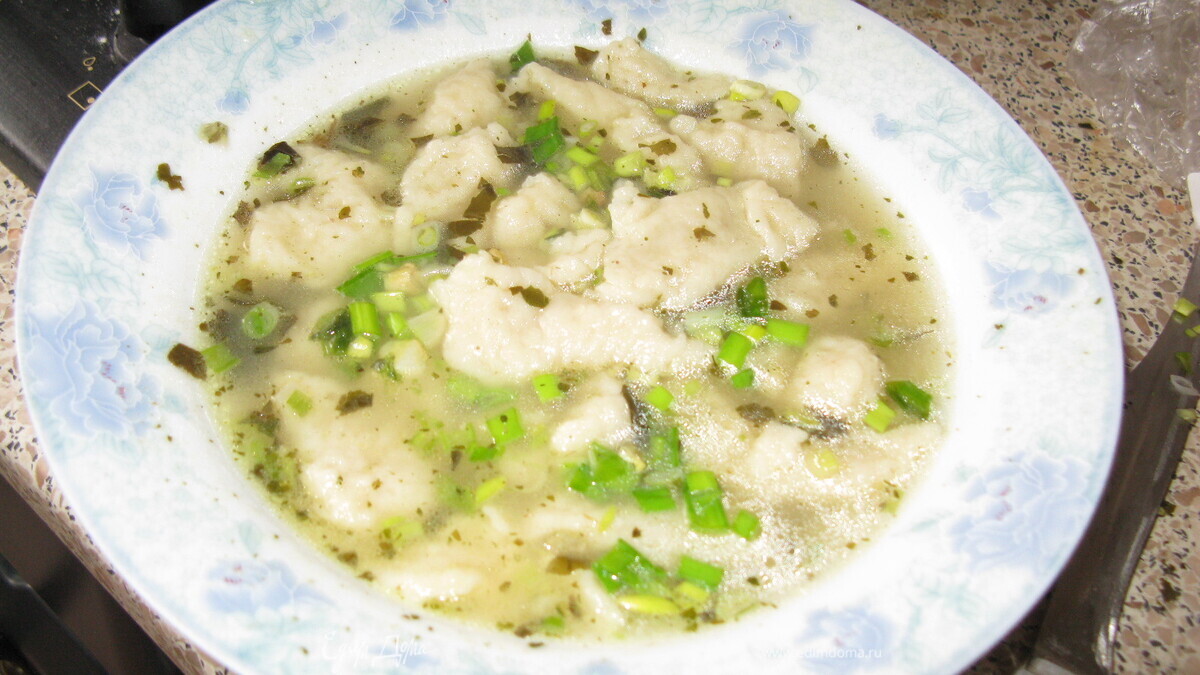 Когда бульон готов, вытащить кости, процедить. От костей отделить мясо для других рецептов.В отдельной посуде сделать тесто. Кусочек масла залить 1 половником горячего бульона,дать разойтись, посолить, добавить яйцо. Добавить муку до консистенции очень густой сметаны. - Шаг 3Чайной ложкой,смоченной каждый раз в холодной воде, берём немного теста и опускаем в кипящий бульон пока тесто не кончится. Добавить зелень. Приятного аппетита!