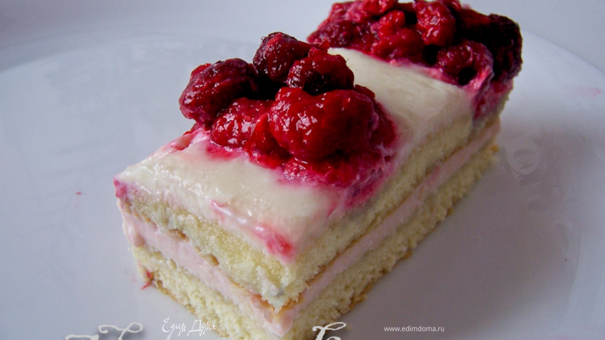 Выложить весь ягодный крем, разровнять. Накрыть вторым бисквитом. Поместить белый крем в кондитерский мешок и выложить полосы на расстоянии примерно 2 см. В промежутки выложить малину. - Шаг 11