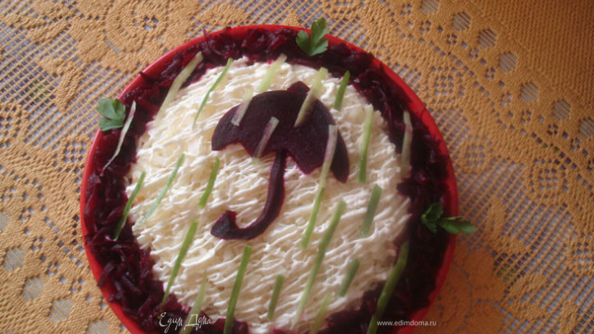 - Подготовкаморковь, картофель, яйца натереть на крупной терке, лук мелко порезать, рыбу размять вилкой. Выложить в салатник слоями: рыба-лук-морковь-яйца-картофель, промазывая каждый слой майонезом. Свеклу очистить, отрезать 2 тонких ломтика, а остальную натереть на крупной терке и выложить вокруг салата. Из одного ломтика свеклы сделать "купол зонтика", из второго - ножку. Из тонко порезанного огурца сделать "дождь". Украсить петрушкой