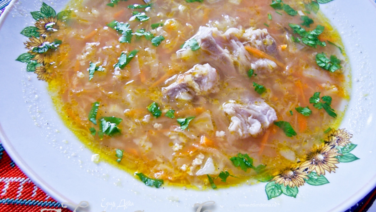 Картофель очистите. Целиком положите в кастрюлю с бульоном и продолжайте варить до готовности картофеля (около 25 минут). Достаньте картофель, разомните вилкой. - Шаг 2Капусту отожмите. Пшено промойте. Положите капусту и пшено в кастрюлю, варите до готовности капусты (около 25 минут).