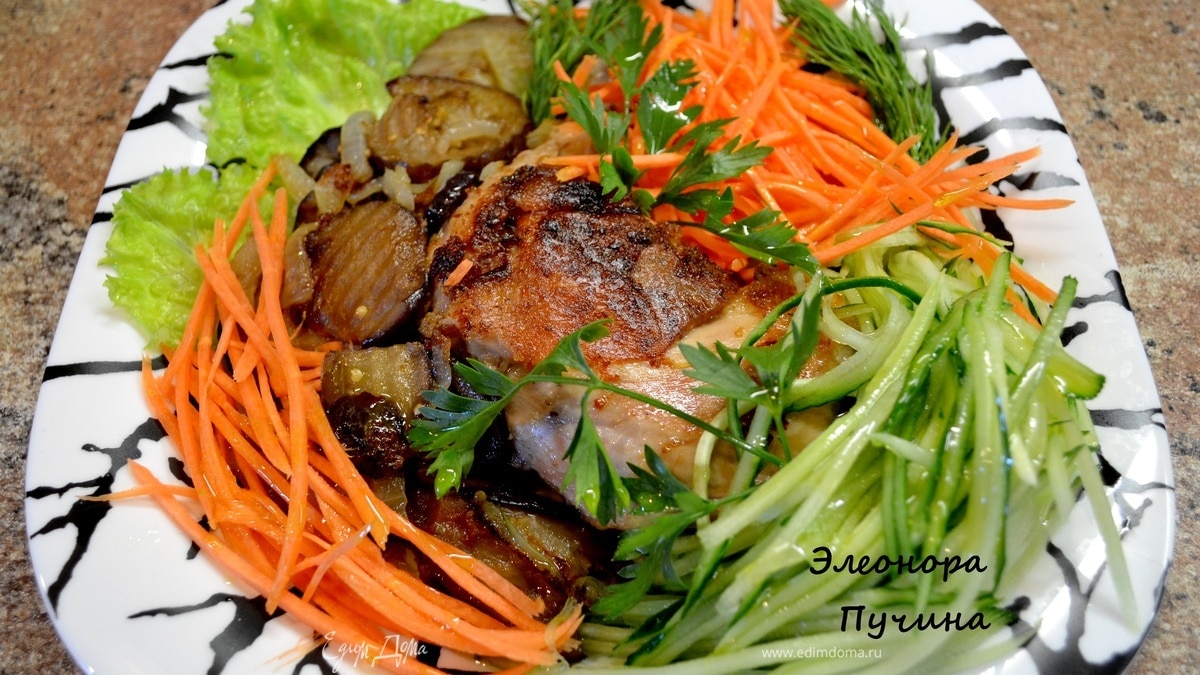 Берём куриные окорочка,пропитываем специями,обваливаем в муке и обжариваем с 2х сторон до готовности.В это время жарим баклажаны с луком на оливковом масле. На тарелку по кругу раскладываем нашинкованную соломкой морковку,огурец(без серединки с семечками),готовые баклажаны,лист салата,в центр окорочок,зелень укропа и петрушки,посолить и полить оливковым маслом.На приготовление потратила 30мин.,всё просто...главное как подать)