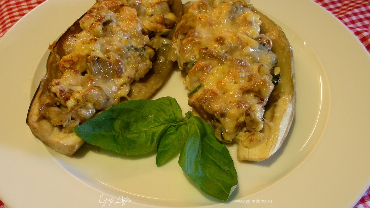 Баклажаны разрезаем вдоль напополам и аккуратно вынимаем мякоть (ложкой или ножом). Я лодочки еще очистила от кожуры (муж ее не ест), но это совсем необязательно. - Шаг 3