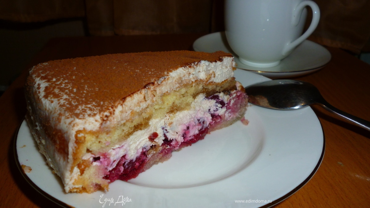 - Шаг 3Сборка торта: В разъемную форму выложить корж, сверху сбрызнуть 50 мл. черного кофе и разложить вишню. Поверх выложить ½ сливочно-творожного крема, накрыть вторым коржом. Сбрызнуть оставшимся кофе и покрыть кремом. Поставить на холод на 4 часа. Перед подачей на стол, вынуть из формы и посыпать смесью из какао и корицы