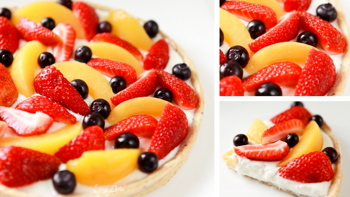 Разложить фрукты, ягоды на пиццу, слегка вдавливая их в творог. Сразу же подать к столу. Приятного аппетита!