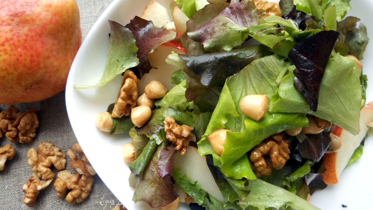 - ПодготовкаВсе чрезвычайно просто: грушу нарезать ломтиками (можно слегка сбрызнуть лимонным соком, по желанию), соединить с салатом, сыром и слегка подсушенными на сухой сковороде орехами. Заправить оливковым маслом и - готово!