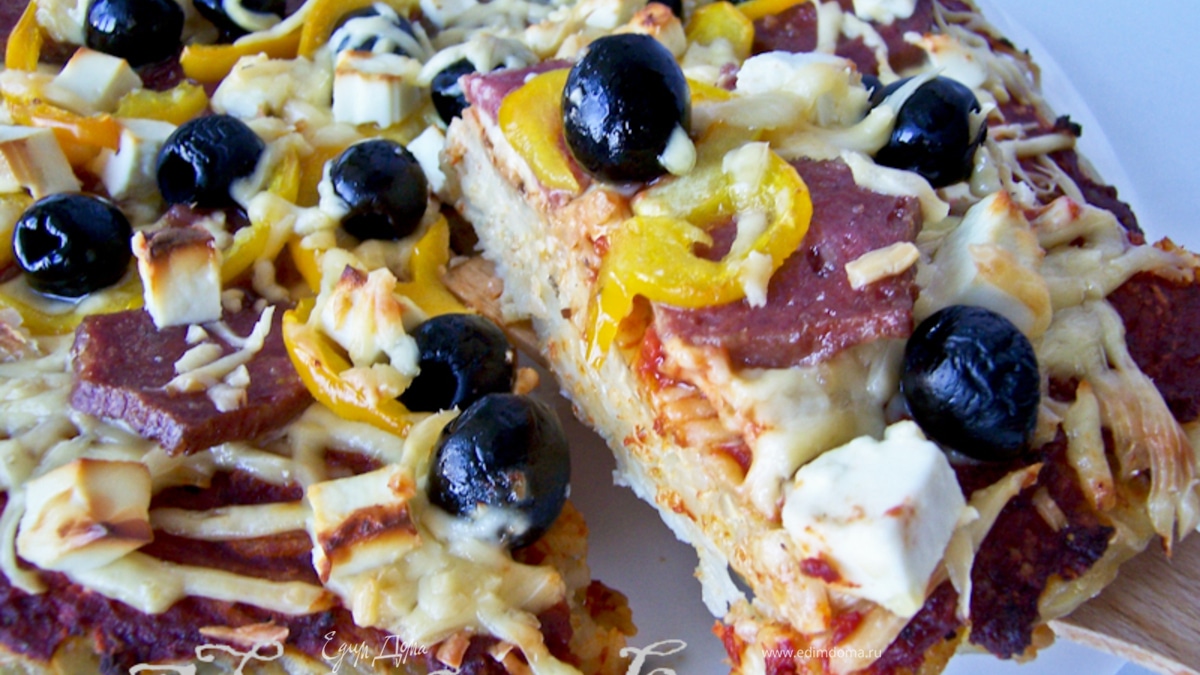 Выложить салями, перец, оливки. Присыпать сверху слегка сыром. - Шаг 7Отправить в духовку на 10-15 минут при 200 градусах. При проготовлении этой пиццы меня посетила идея сделать ее даже на сковороде! Думаю, тоже получилось бы неплохо, эдакий вариант для студентов и холостяков :) Приятного аппетита!