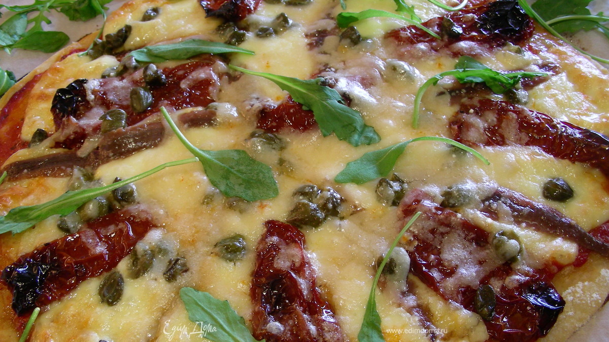 Пицца в средиземноморском стиле с анчоусами, каперсами и вялеными томатами (тесто на пахте)