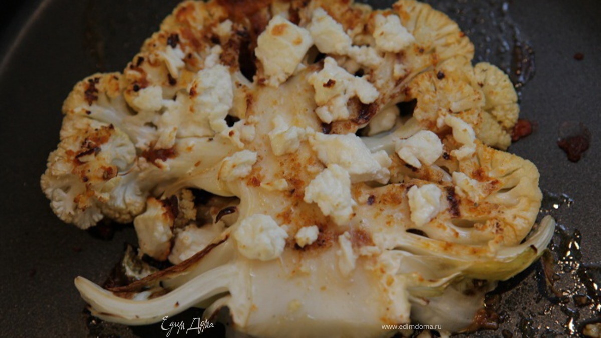 Разогреть сковороду-гриль, выложить цветную капусту, сбрызнуть оставшимся оливковым маслом и обжаривать по 2–3 минуты с каждой стороны (переворачивать можно только один раз!). - Шаг 4
