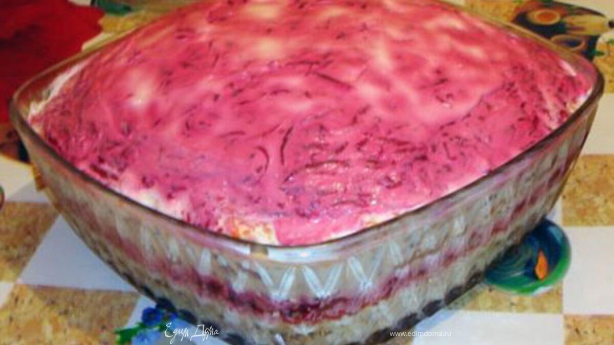 - Шаг 2Свеклу отварите и смешайте с орехами. Выложите слоями. Все слои промажьте майонезом.
