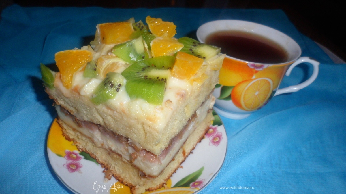 Фрукты чистим и нарезаем, выкладываем сверху. Для приготовления желе: вскипятить воду, всыпать готовое желе из пакетика и хорошо размешать, полить им пляцок. Дать желе немного застыть. Поставить в холодильник на ночь. Приятного чаепития!!!