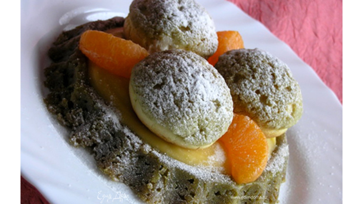 украсить профитролями (у меня с грейпфрутовым кремом по этому рецепту ссылка на рецепт и ощиченными от пленок дольками мандаринов. По желанию посыпать сахарной пудрой.