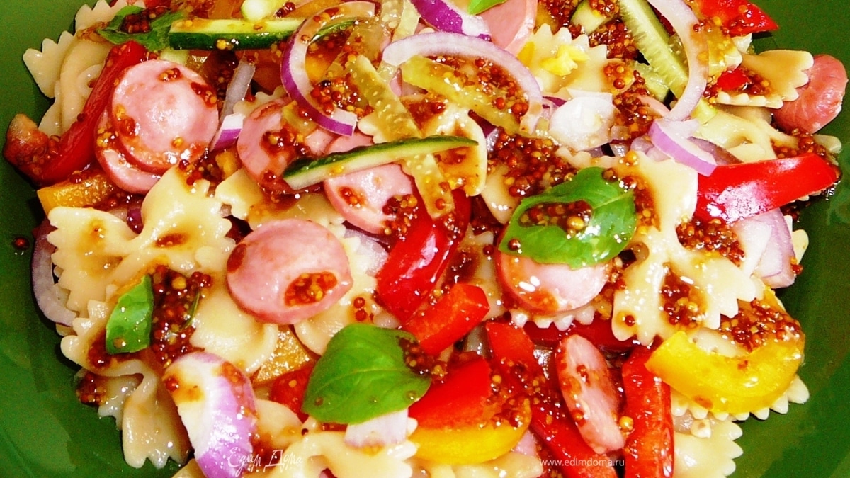 - Шаг 1Фарфалле отварить аль денте, сосиски порезать колечками и слегка обжарить, красный и желтый перцы и огурец нарезать соломкой, фиолетовый лук-полукольцами. Всё соединить и полить соусом. Соус-зернистая горчица+соевый соус+лимонный сок+растительное масло.