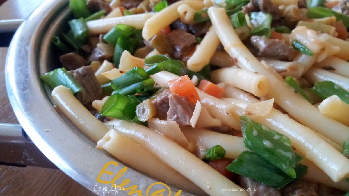 И смешайте их соусом. Присыпьте зеленым луком. К такому аппетитному блюду подойдет сыр пекорино или пармезан. Приятного аппетита. PS:Мои детки все слопали за милую душу!