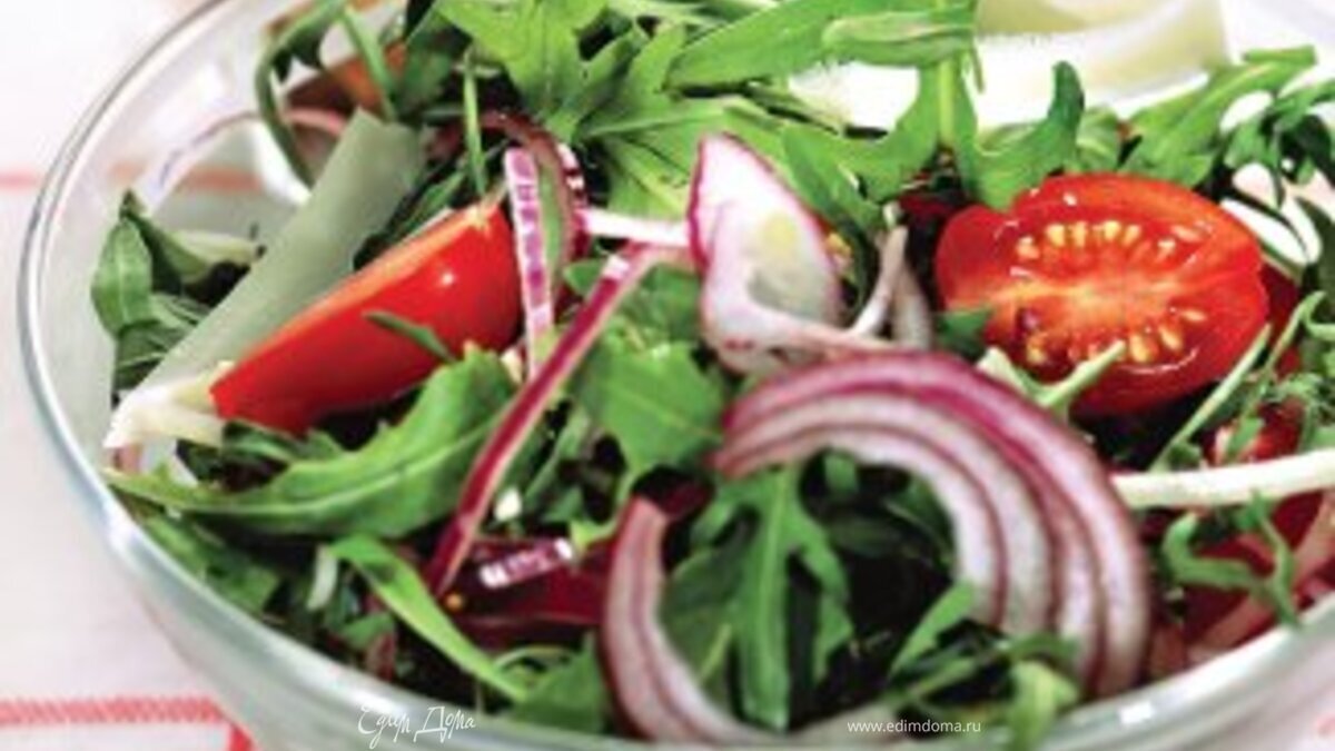 - Шаг 1Руколу вымыть и обсушить. Помидоры вымыть и разрезать на 2 части. Лук очистить и нарезать полукольцами. Чеснок очистить и нарезать пластинами. Половину пармезана натереть на мелкой терке, оставшийся сыр тонко нарезать. Хлеб нарезать тонкими узкими кусочками, сбрызнуть маслом и присыпать тертым пармезаном. Запечь в разогретой до 200 °С духовке, 2–3 мин., или пожарить на гриле. Масло смешать с уксусом, солью и перцем. Смешать в миске руколу, помидоры, лук,чеснок и пластины пармезана. Полить заправкой. Подавать салат с крутонами.