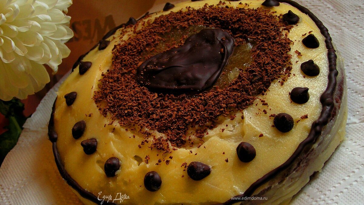 затем достать и вторым слоем ровно нанести крем еще раз. Выложить украшения из шоколада( см. в комментарию к рецепту) и посыпать вокруг желе тертым шоколадом_ - Шаг 13