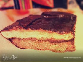 Нуга уже готова. Я положила один вафельный корж, на него выложила половину массы, разровняла и накрыла вторым вафельным коржом (и так дважды). Чтобы были ровные края, делала в формовочном кольце. Поставить в морозильную камеру для застывания на несколько часов (лучше на ночь). После этого нарезать ножом и подавать. Меня очень удивило, что нуга из морозильной камеры не такая ледяная холодная, как например мороженое или сок, очень вкусная с кофе или чаем. - Шаг 7Как я говорила выше, можно нугой прослоить слой печенья или бисквита (аналогично моим вафельным коржам), а можно и глазировать шоколадом. Для этого нужно выстелить форму пищевой пленкой, выложить нугу и поставить в морозильную камеру. Затем нарезать и кусочки окунуть в растопленный шоколад. После этого дать застыть.