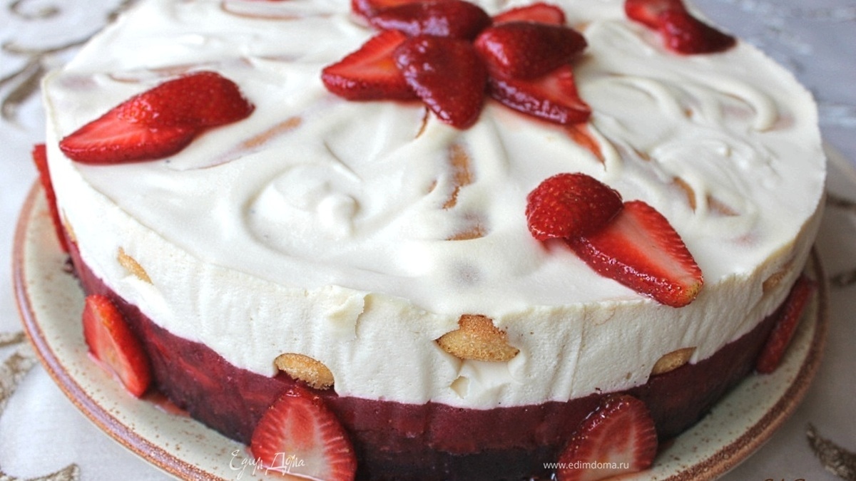 Ставим торт в холодильник минимум на 4 часа. У меня торт простоял ночь. С утра я сняла кольцо и пергамент с боков. И украсила торт ягодами. Порезанные лепестками ягоды я выкладываю на лист одним слоем, растапливаю джем в микроволновке. Можно буквально 1 ст.л. воды добавить, если джем слишком густой. Остывшим джемом при помощи кисточки смазываю лепестки ягод с двух сторон. Отправляю в холод минут на 10, чтобы джем застыл, оформляю торт и ещё немного прохожусь кисточкой с джемом по ягодам. Ставлю охладиться торт хотя бы на полчаса.