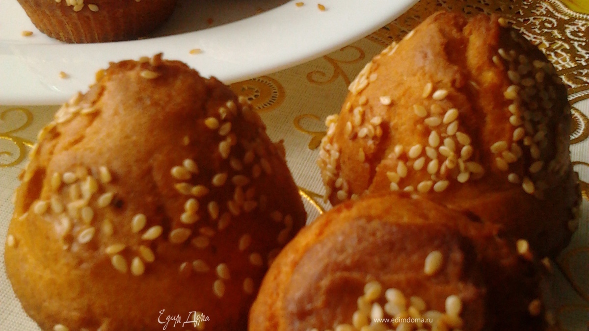 разливаем наше тесто по формочкам смазав их маслом(у меня силиконовые я не смазывала)сверху посыпать кунжутом - Шаг 4