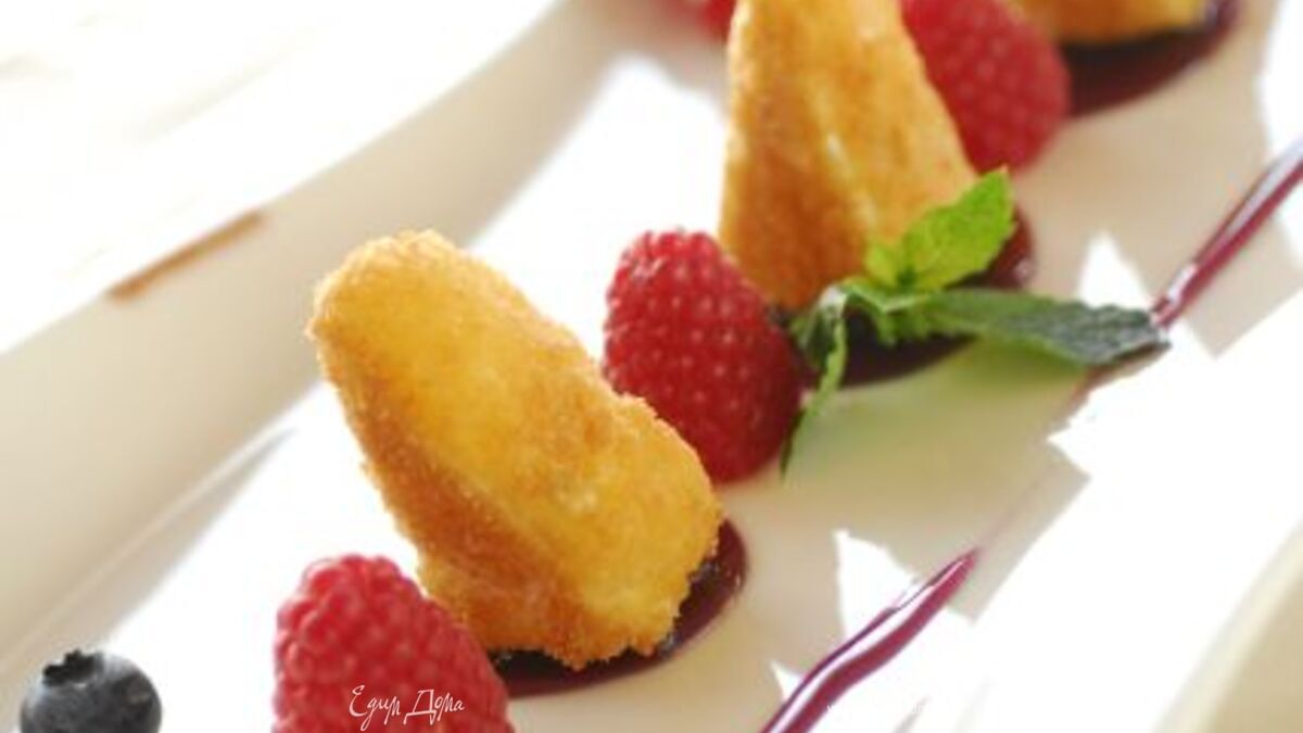 - Шаг 11. Кружок сыра делим на порционные треугольнички. 2. Взбиваем желтки венчиком. 3. Обваливаем сыр в муке. 4. Обваливаем сыр в яйце. 5. Обваливаем сыр в панировочных сухарях. 6. Разогреваем фритюр (можно использовать обыкновенную сковороду). 7. Обжариваем сыр в течение 1,5-2 минут, а затем вынимаем его и даем стечь жиру. 8. Вливаем вино в отдельную посуду и доводим его до кипения. 9. Добавляем в вино ягоды и кипятим 2-3 минуты. 10. Взбиваем ягоды блендером. 11. Блюдо поливаем соусом. 12. Выкладываем на тарелку кусочки сыра, перемежая их ягодками малины. 13. В качестве изящного кулинарного декора используем веточку свежей мяты