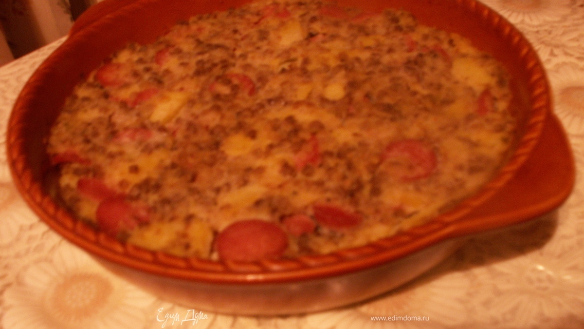 - Шаг 5Колбаски очистить от кожуры, нарезать кружочками и выложить на смесь. Сверху "закрыть" все остатками гречнево-рисово-картофельной смеси.