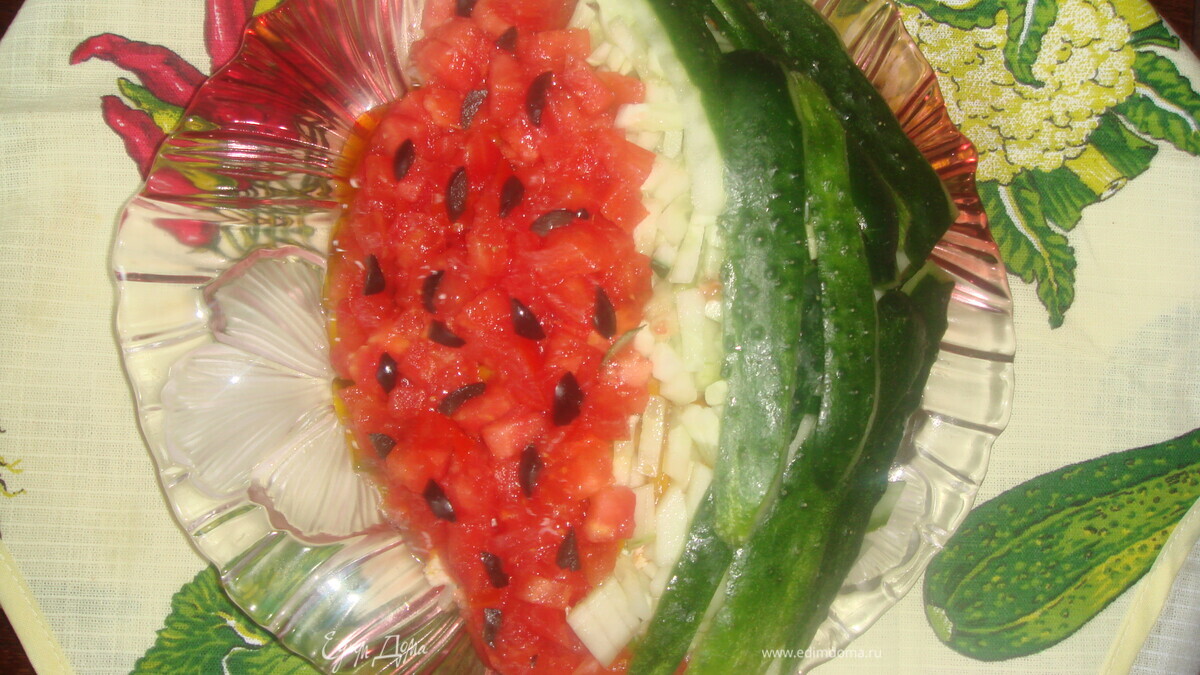 Режем помидор маленькими кусочками, с огурца снимаем кожу, режем мелко. Все выкладываем как на картинке, украшаем нарезанной маслинкой, делая из нее как бы арбузные косточки.