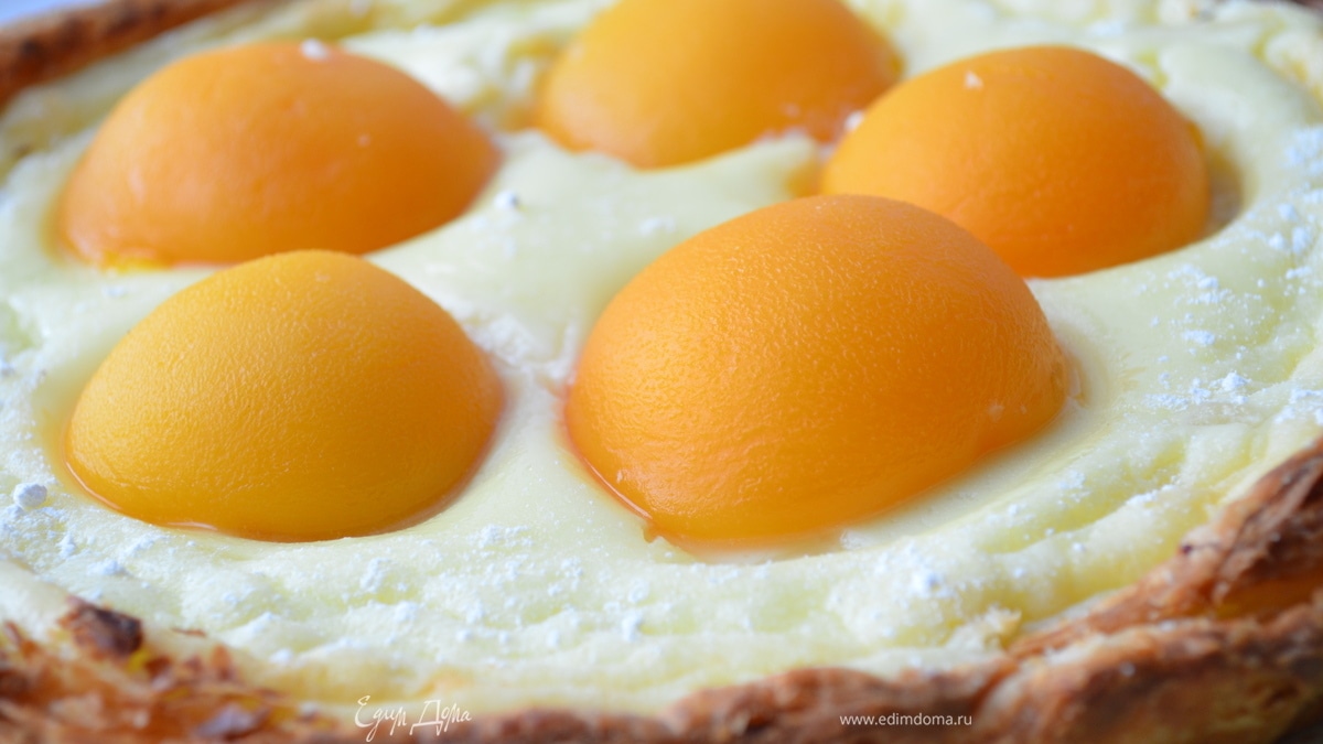 Достать пирог, выложить на него половинки персиков, присыпать пудрой и отправить еще на 10 минут в духовку, при той же температуре.
