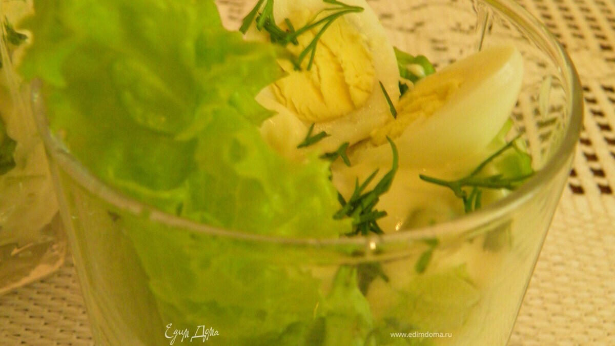 - Шаг 4Разложить салат в стаканы, украсить салатными листьями. Для своего слата, для украшения, я отварила перепелиные яйца и порубила немного укропа. Салат также можно ипользовать для перекуса или легкого ужина. В одной порции всего 200 ккал.