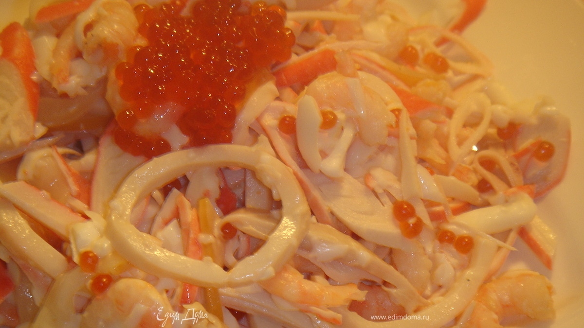 - Шаг 1Кальмары отвариваем в кипящей воде не более 3 мин.,нарезаем соломкой или кольцами - кому как нравится. Крабовые палочки тоже нарезаем соломкой или по диагонали, рыбу нарезаем соломкой.Белки от яиц натираем на крупной терке. Соединяем кальмары,крабовые палочки, креветки,рыбу,белки, затем добавляем красную икру и перемешиваем. Заправляем майонезом и аккуратно перемешиваем. Приятного аппетита!