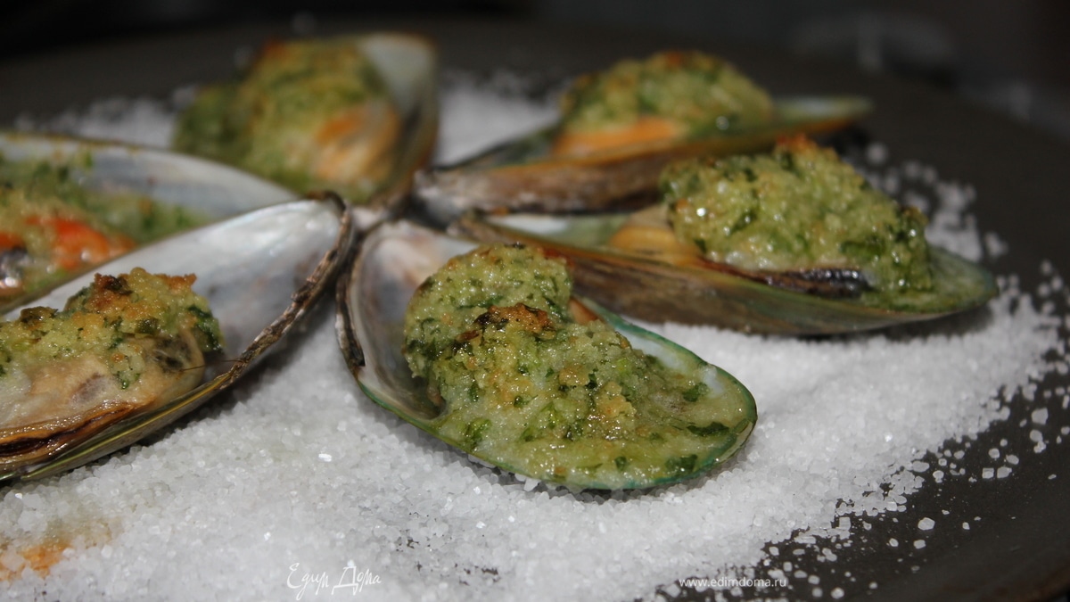 - Шаг 1Мидии промыть просушить. Разложить на противень посыпанный солью (что бы створки не раскачивались).