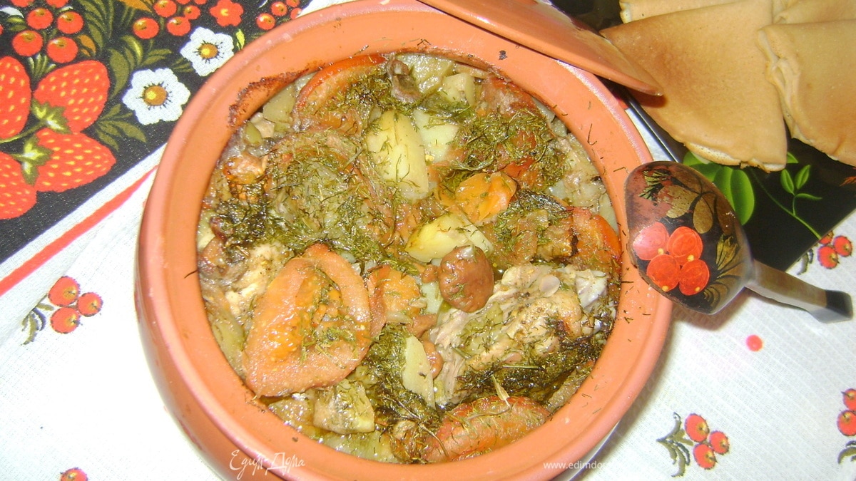 луковицу полукольцами нарезала,перец соломкой,морковь на кружочки,картофель кубиками,окорочка разрезала,очистила от кожицы,помидор тоже ошпарила,очистила от кожицы,нарезала дольками. сначала поджарила лук,добавила к нему перец и морковь,позже грибы,соль,перец,пожарила до готов грибов.(минут 7-10) в миске смешала курицу,картофель,помидор,специи и поджарку,все хорошо перемешала,выложила в горшочек,налила воды(горячей) 2 чашки,приблизительно 0,5 литра и отправила все это в духовку,на час....до готовности